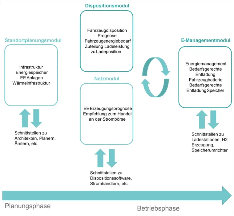 - Das Standortplanungsmodul übernimmt die dynamische Planung und Dimensionierung der elektrotechnischen Anlagen wie den Ladesäulen und der Infrastruktur für Wasserstoff an einem Logistikstandort. Aus der Planung soll ein Tool zur Konzeptionierung hervorgehen, welches sowohl die logistischen Randbedingungen (wie z.B. die Logistikmanagementsoftware) als auch die energietechnischen Randbedingungen (bspw. vorhandene Lastgänge und energiemarktwirtschaftlichen Daten) an dem Logistikstandort berücksichtigt. Vor allem soll die Auslegung des Netzanschlusses und die Dimensionierung sowie Optimierung lokaler erneuerbarer Energieanlagen und stationärer Speicher automatisiert und standardisiert werden.